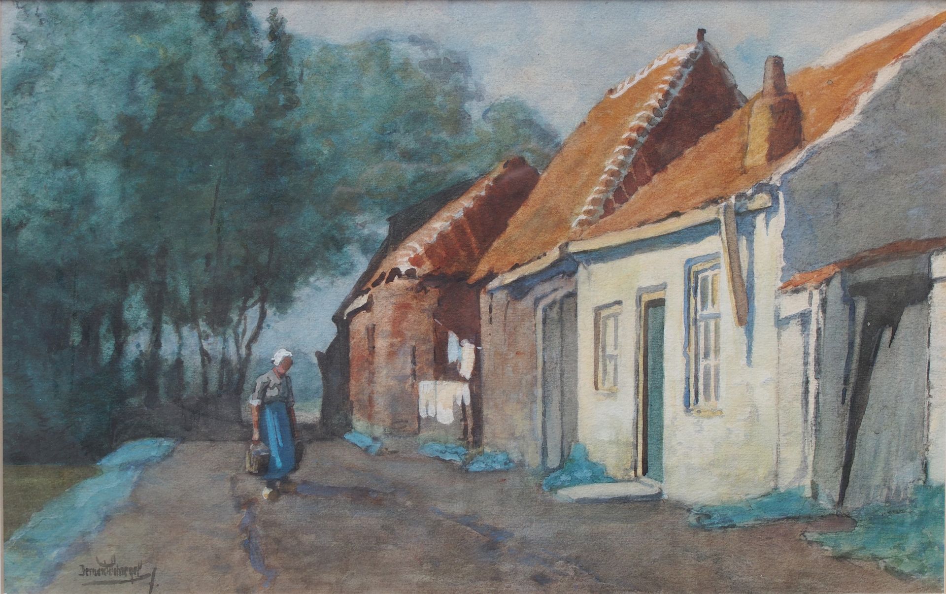 His work is appreciated for the realistic and lively depiction of landscapes, farmhouses, and figures, with special attention to details in light and shadow, as well as his talent for creating atmospheric and evocative scenes. Often, it involves a combination, figures in a landscape or working on the farm. From the watercolor mentioned above, a landscape with a stream and a sheepfold with a shepherd in a red jacket, an oil painting is also known.
