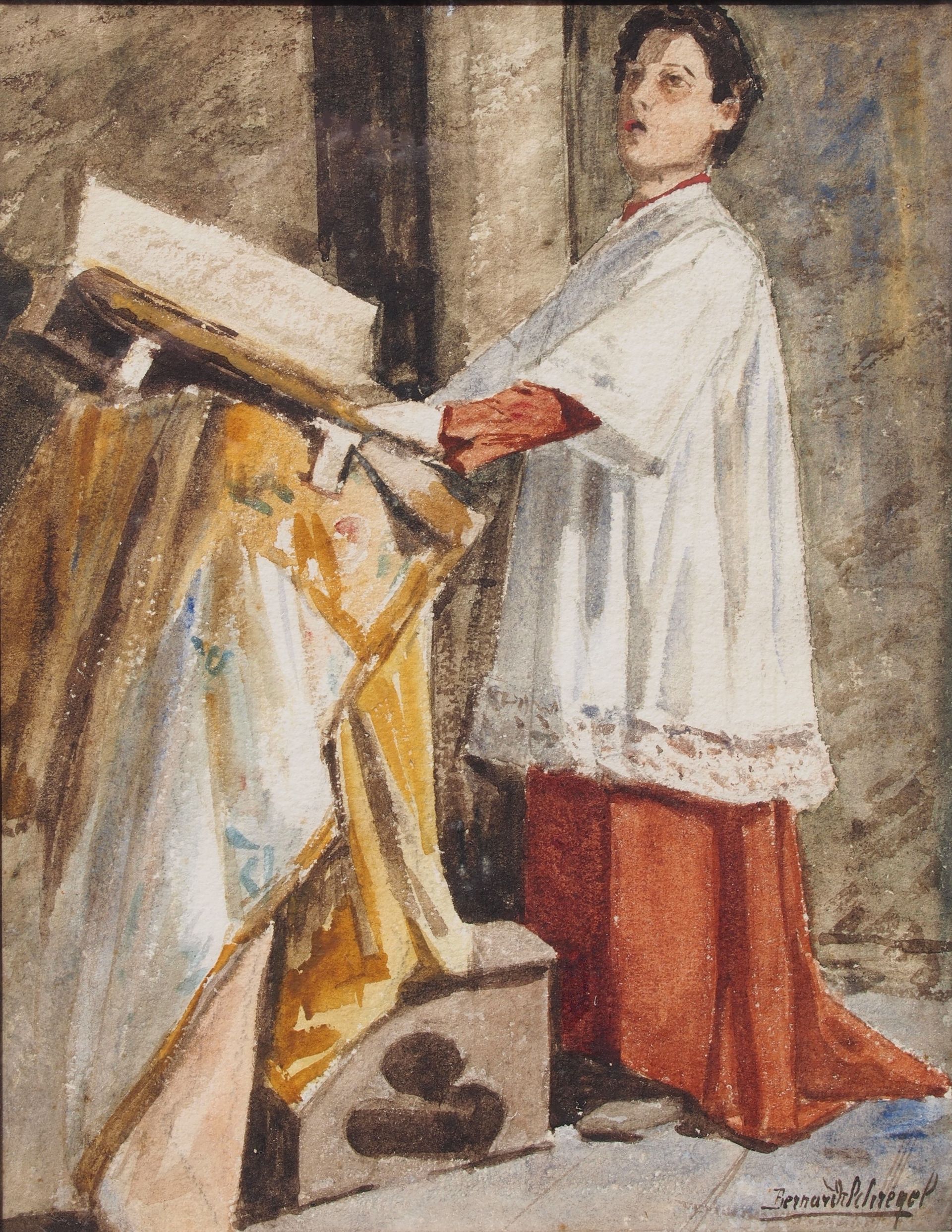 The early works laid the foundation for his later successes. Newspaper reports about Bernard Schregel around the turn of the century reveal that he was highly esteemed as an artist, particularly for his ability to capture light effects in his landscapes and for his excellent figure studies, as seen in his watercolour of a singing acolyte. His works, such as "Potato Peelers" and the landscapes and farmsteads with powerful sun and shadow effects, were praised in reviews for their liveliness and realism. His skill in drawing animals, especially cows and poultry, is also emphasized.