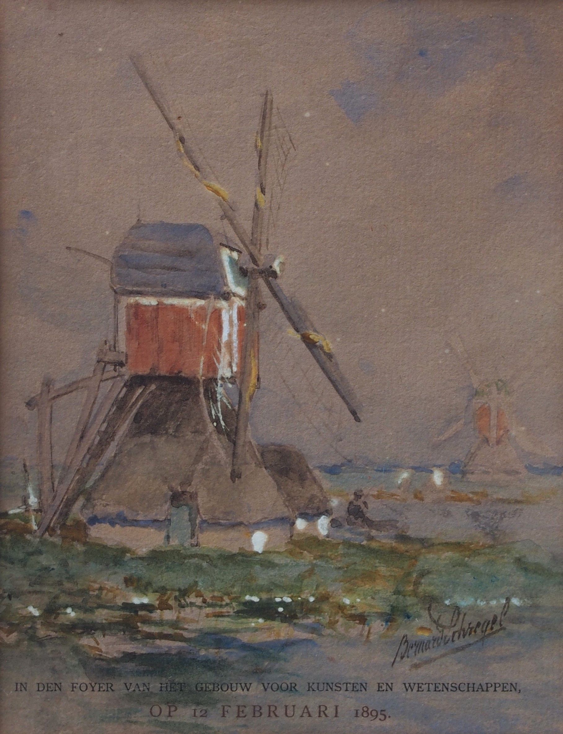 Bernard Schregel's talent was quickly recognized through the praise he received in the late nineteenth century in the Dagblad van Zuidholland en ’s-Gravenhage. His works "Duck Hunting" and "Drinking Cow" were praised for their technical skill and natural representation, showcasing the young artist's potential. On February 11, 1895, this newspaper reports on the literary and musical art evening in favour of the Association for the Poor Care, organized by the Hague Art Club Jong Holland. This soirée took place in the cozy foyer of the Building for Arts and Sciences in The Hague (known as the K & W building, which was destroyed by fire in 1964). In addition to Bernard Schregel, artists such as Johannes Akkeringa, Louis Apol, Floris Arntzenius, Bernard Blommers, Jozef Israëls, Willem van Konijnenburg, Jacob and Willem Maris, Hendrik Willem Mesdag, and Jan Toorop kindly contributed to this charity evening by providing illustrations for the program, giving it lasting value. The illustrated programs were offered to the public by young people, and the remaining ones were subsequently exhibited and sold at the firm Goupil and Co. Schregel's illustration featured a watercolour of a polder landscape with a windmill and a fisherman, depicted here