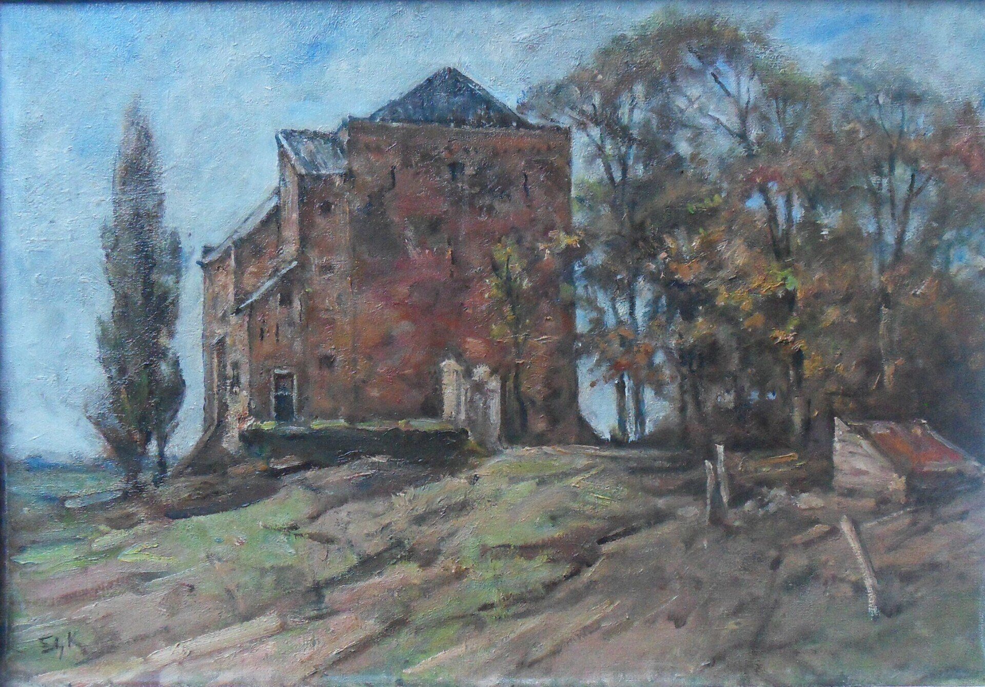 Olieverf op doek van kasteel Nijenbeek te Voorst, gesigneerd linksonder en voorzien van annotatie kleindochter E.Th. Yates, afmeting 36x50 cm.
