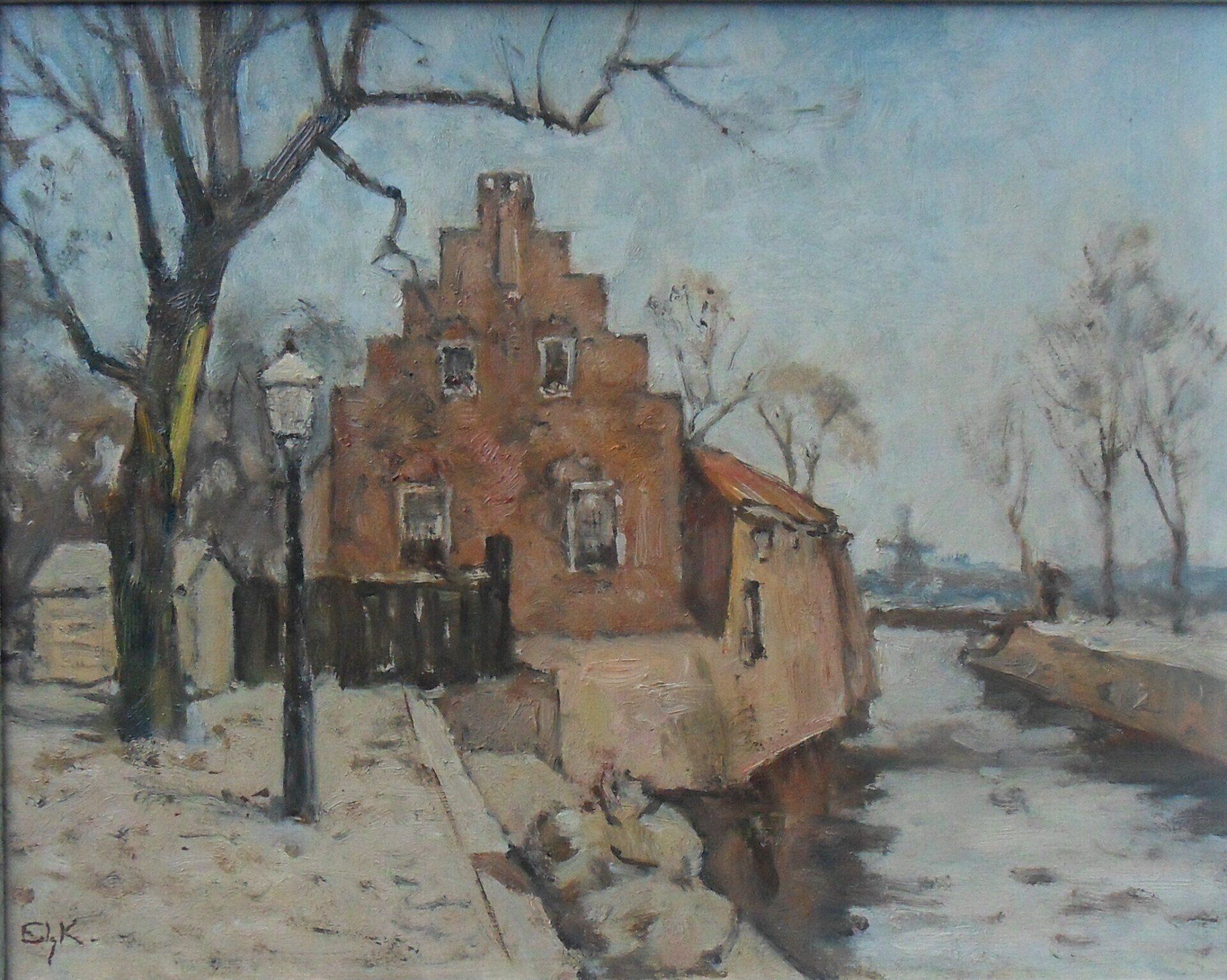 Olieverf op doek van het voormalig Poortwachtershuisje te Damsterdiep in Groningen, zie ook aquarel van zelfde locatie, gesigneerd linksonder, afmeting 25x30 cm.