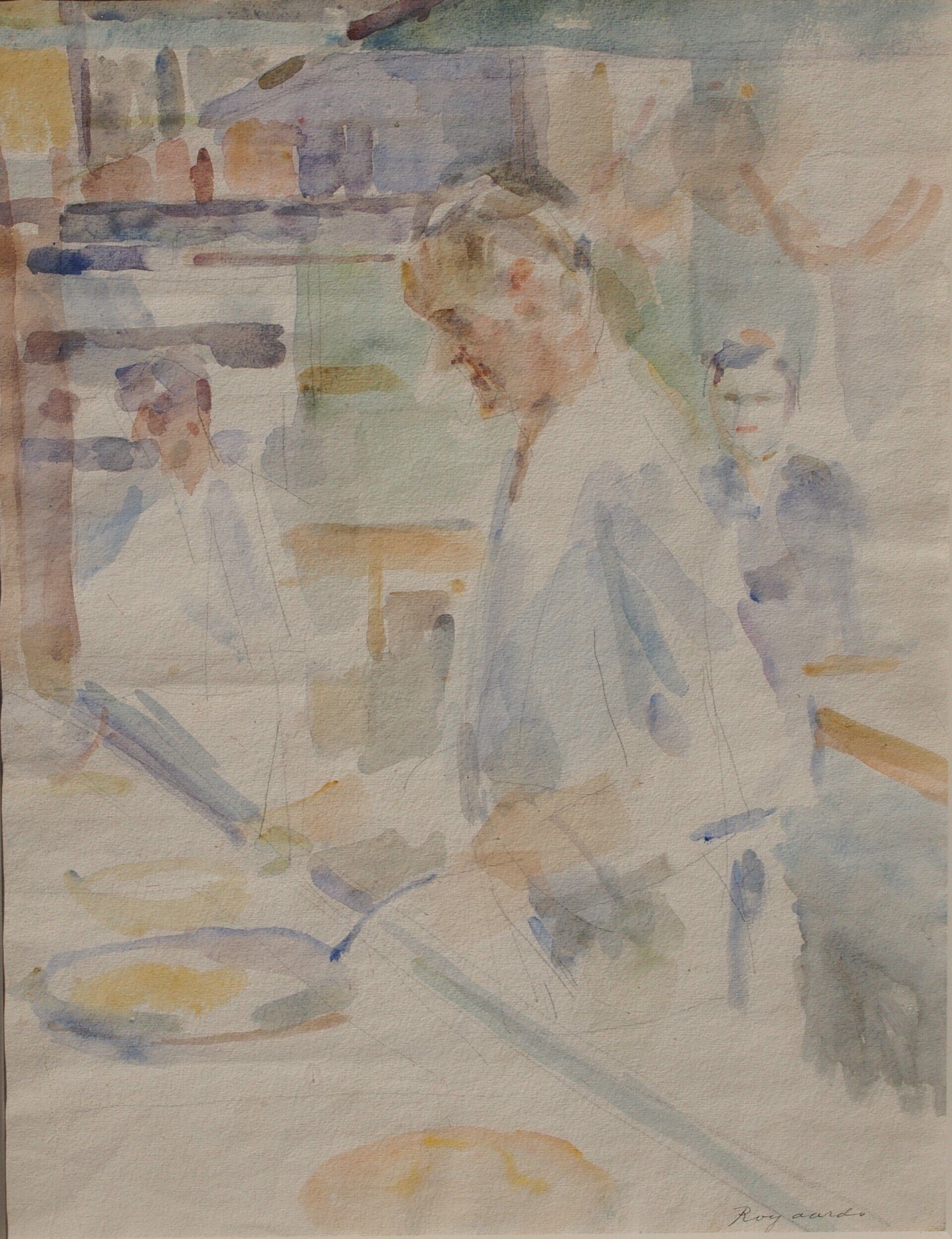 Aquarel van een kok aan het fornuis in een restaurant, gesigneerd rechtsonder.