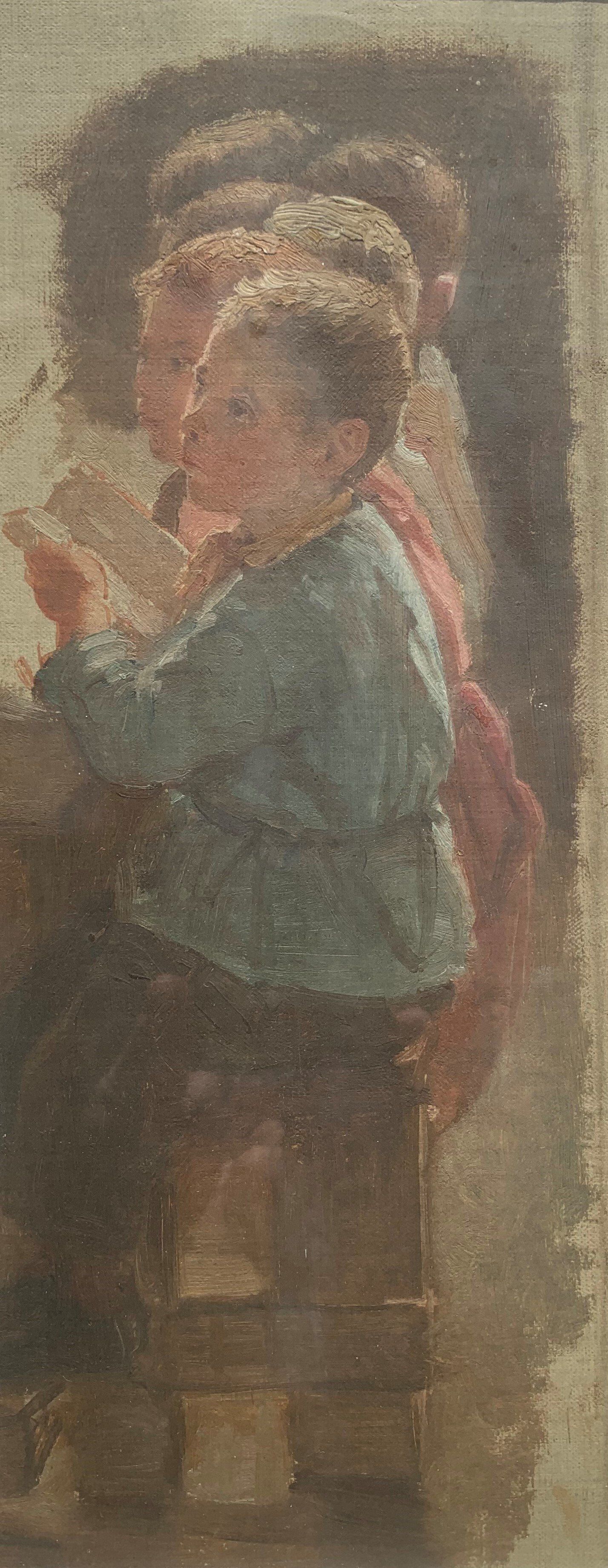 studie olieverf van een rij schoolkinderen zittend op een houten bank, afmeting 12x30 cm