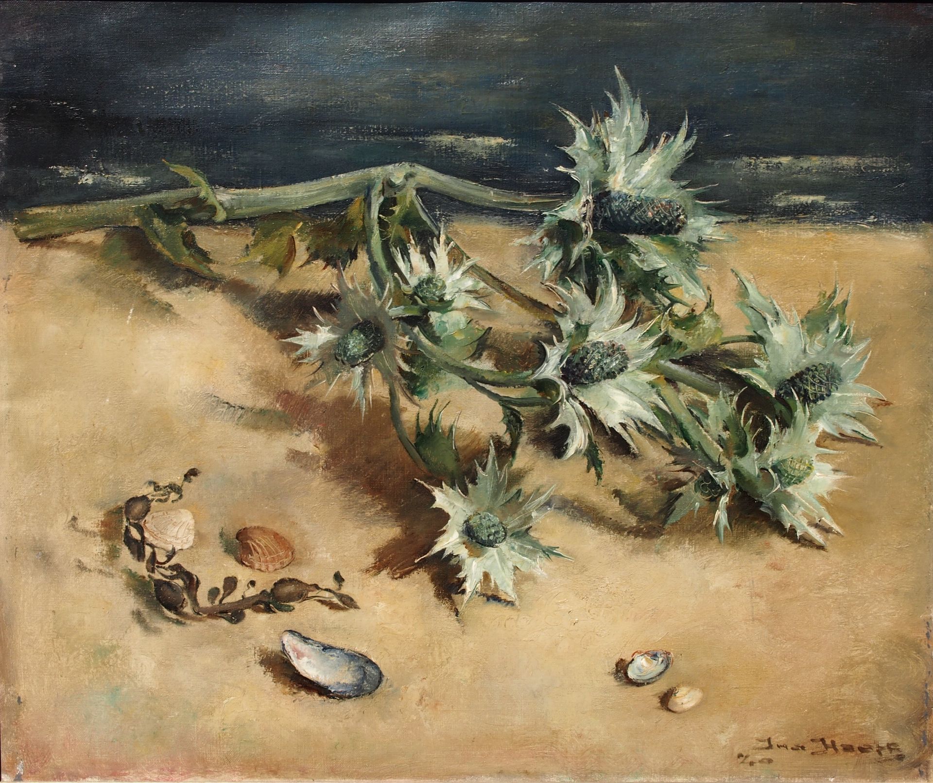 Ina Hooft, geboren in een tijdperk waarin de impressionistische beweging nog nazinderde in de Europese kunst, wist deze invloeden op subtiele wijze in haar eigen werk te verweven. Haar stillevens en portretten zijn doordrenkt met een lichtgevoeligheid die doet denken aan de impressionisten, maar met een unieke toepassing die haar werk onderscheidt. Hooft’s benadering van licht is niet alleen een kwestie van weergave maar ook van interpretatie, waarbij zij licht gebruikt om de emotionele receptie van haar onderwerpen te versterken. Haar schilderijen, portretten en bloemstillevens, tonen een verfijnd begrip van de nuances van licht en schaduw. Deze werken illustreren haar vermogen om de transparantie van licht vast te leggen, een kenmerk dat centraal staat in het impressionisme. Hooft's gebruik van licht gaat verder dan de fysieke weergave; het dient om de textuur en de materiële kwaliteit van haar onderwerpen te verlevendigen, van de fragiele bloemblaadjes tot de stof van een kledingstuk. In het werk ‘Distels en Schelpen’ toont Hooft haar bekwaamheid in het combineren van natuurlijke elementen om een compositie te creëren die zowel harmonieus als dynamisch is.