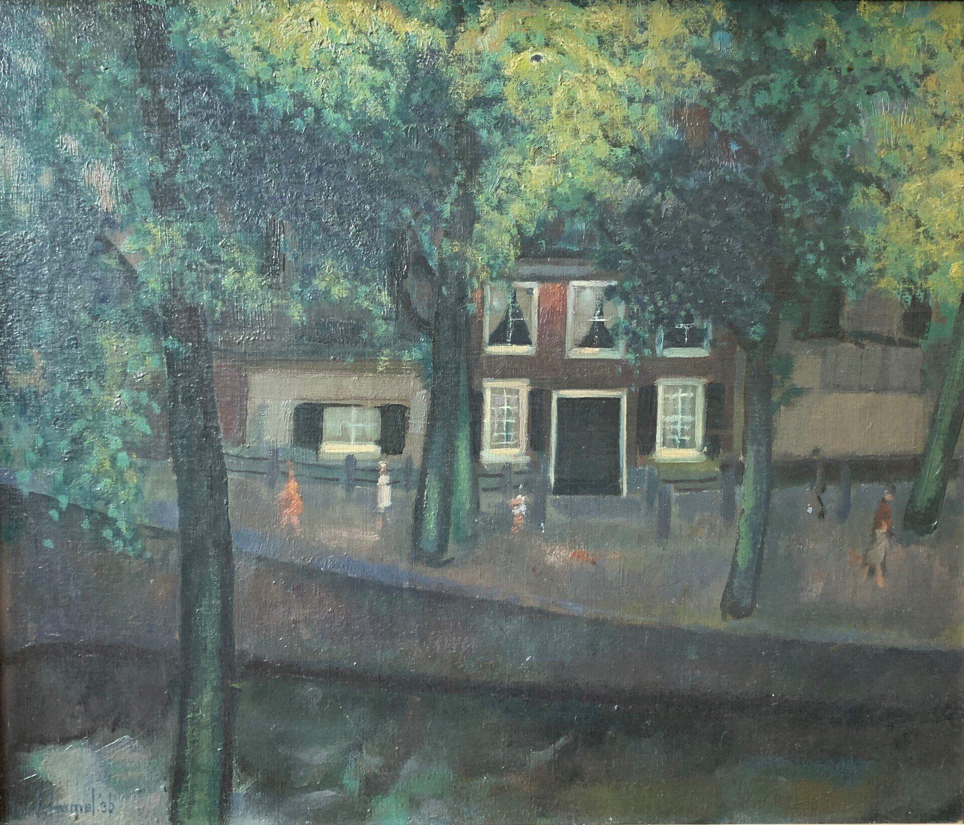 Olieverf op doek van spelende kinderen langs de Reguliersgracht op de hoek Kerkstraat aan de zijde van het Amstelveld te Amsterdam. Op de achtergrond de Amstelkerk, gelegen aan Amstelveld 2-8. Gesigneerd linksonder, gedateerd 1936, afmetingen 50x60 cm. Provenance: Expositie in De ronde brug, Reguliersgracht Amsterdam, april 1938; Van Zadelhoff Veilingen, maart-aprilveiling 2013, cat.nr. 883.