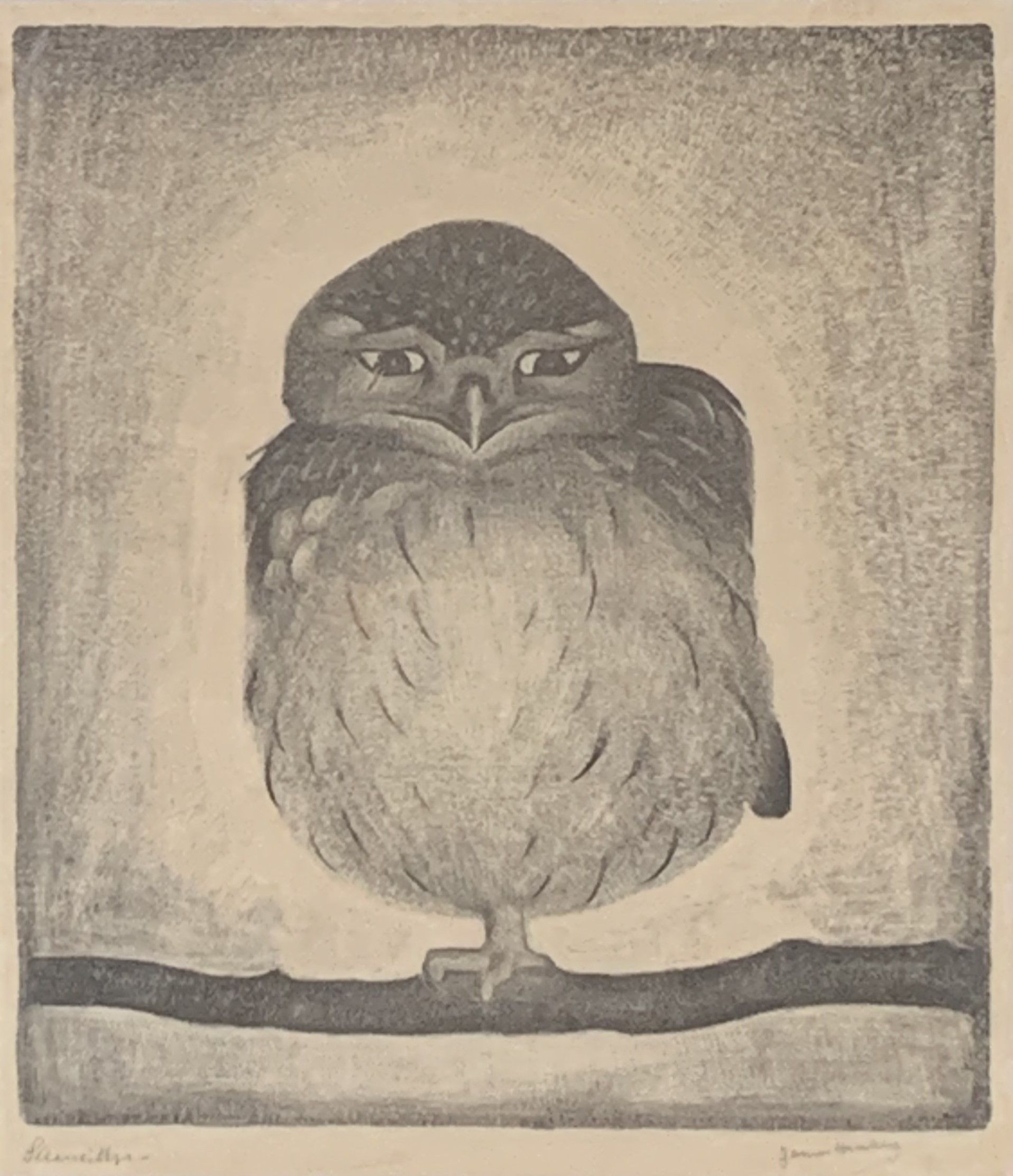 Grafisch werk / litho van een steenuiltje, op een tak op één poot. Annotatie verso: eigen druk Jan Wittenberg. Gesigneerd rechtsonder in potlood, afmeting 19x15 cm.