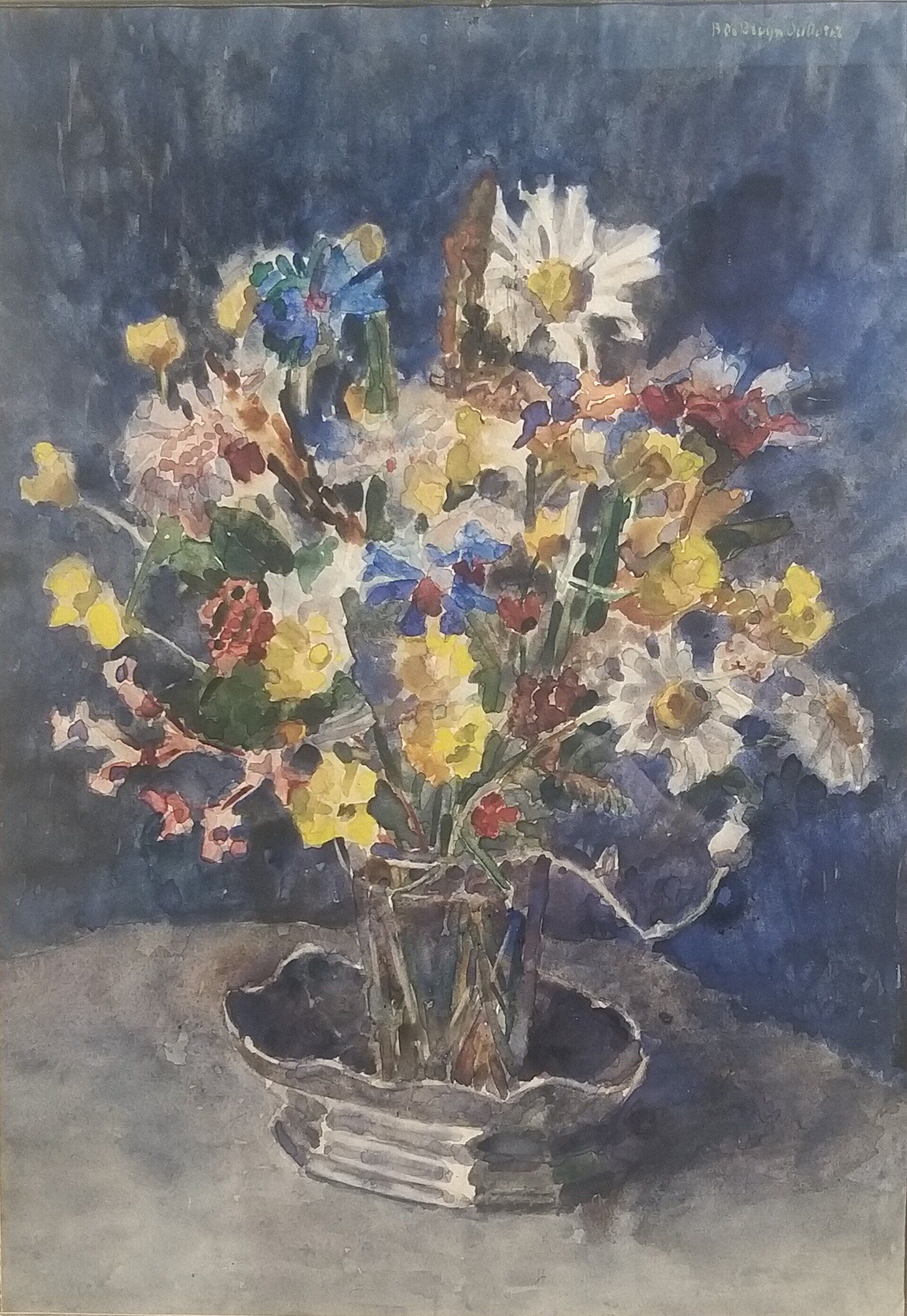 Aquarel van een kleurrijk bloemstilleven in een glazen vaasje, geplaatst in een zilveren bakje, gesigneerd rechtsboven, afmeting 34,5x25 cm.