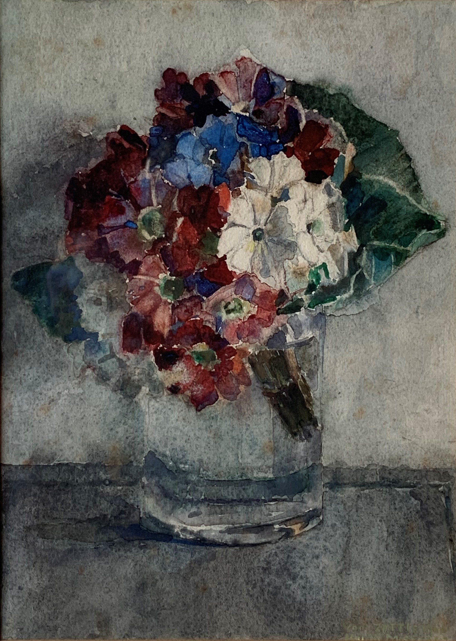 Aquarel van primula’s in een glas, gesigneerd, afmeting 21,5x15,5 cm.